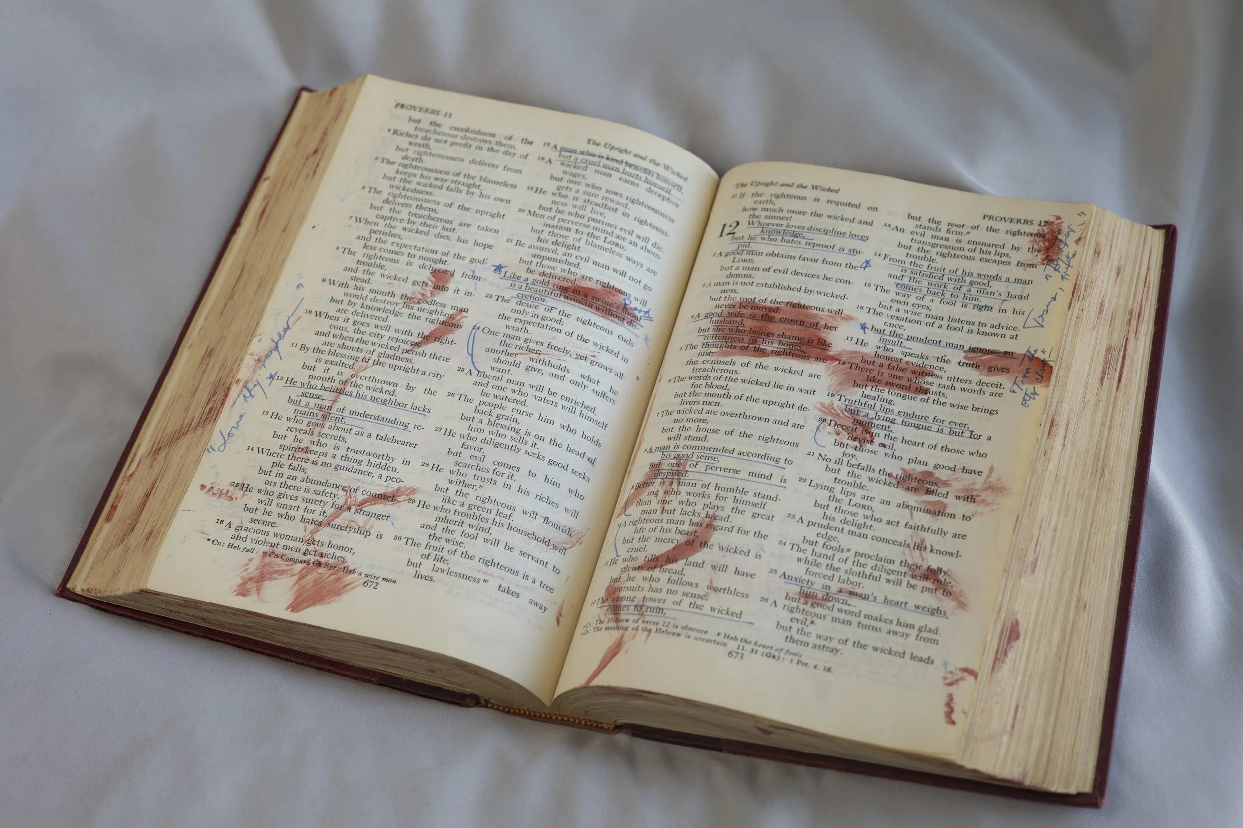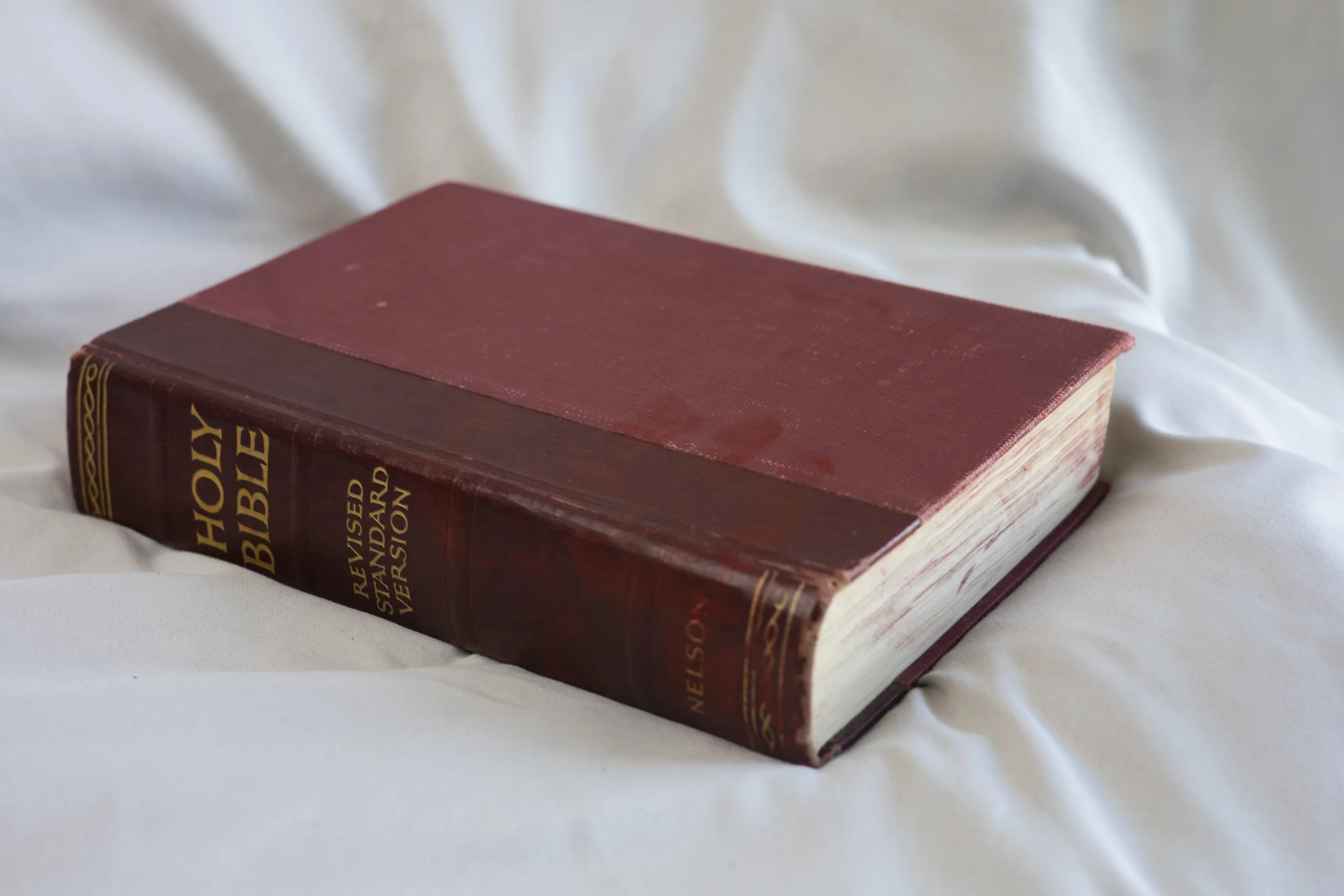 A Bible Study aims to explore and disrupt the visual conventions of the Bible. This series has a process integral to its meaning; both pieces began as found or purchased Bibles, and were transformed through various processes to hold new meanings.